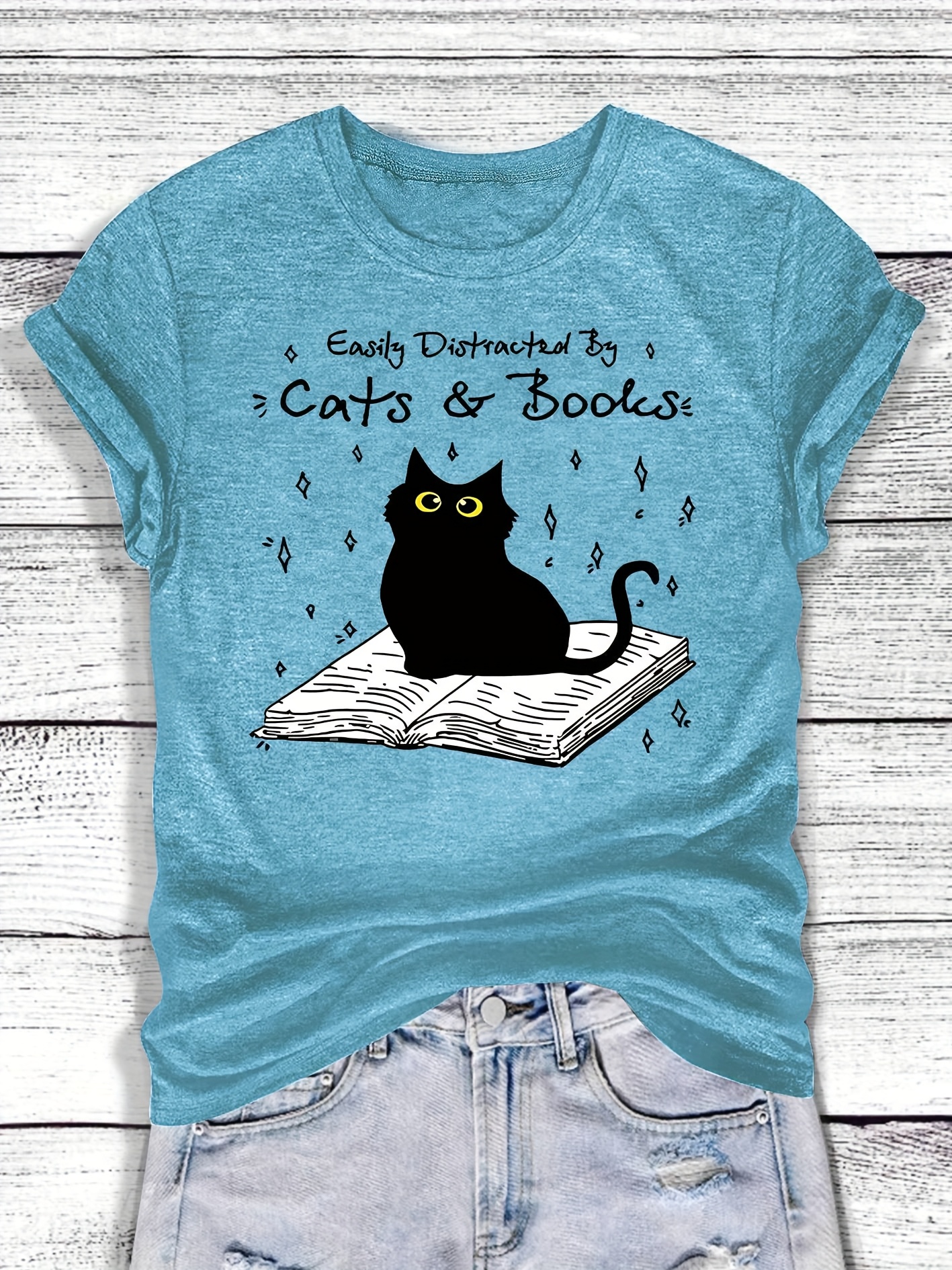 [Playful Cat T-Shirt] Lightweight & Stretchy Charming Black Cat & Book Illustration T-Shirt | Casual Crew Neck, Short Sleeve, Perfect for Spring & Summer, S-XXL, Cat Lover Gift