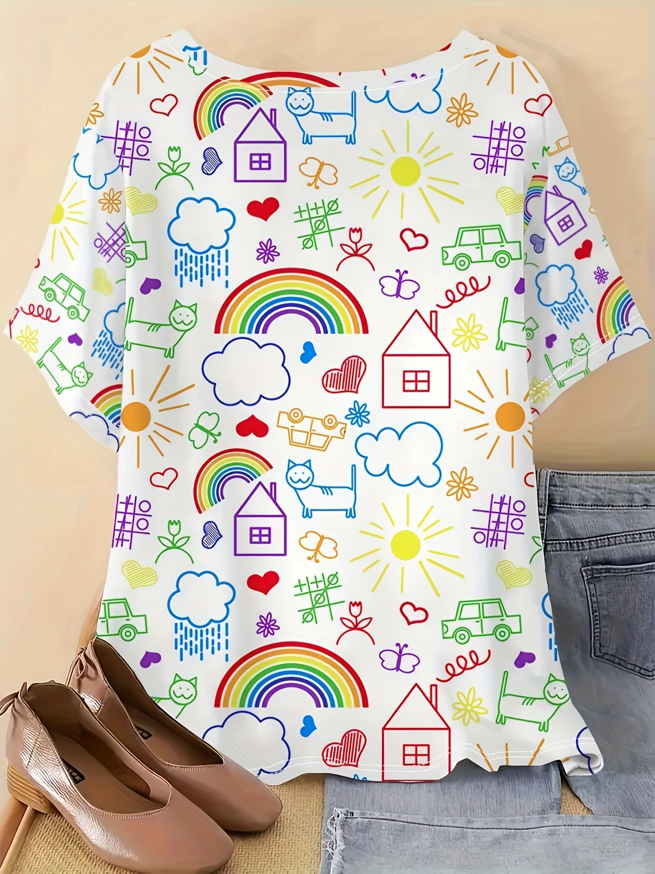 Plus Size - Fun Graffiti 3D Print, Comfortable And Breathable Elastic Fabric, Casual Loose Fit, Machine Washable Round Neck Short Sleeve T-Shirt, Suitable for Spring, Summer, And Autumn Outdoor And Weekend Gatherings.