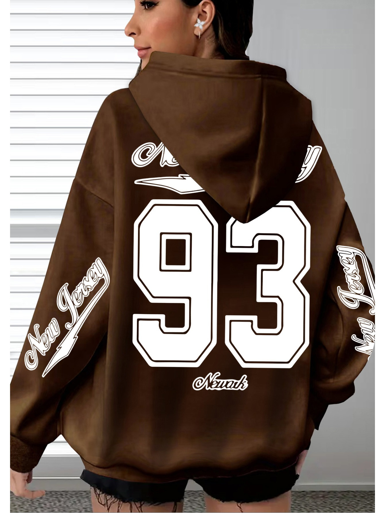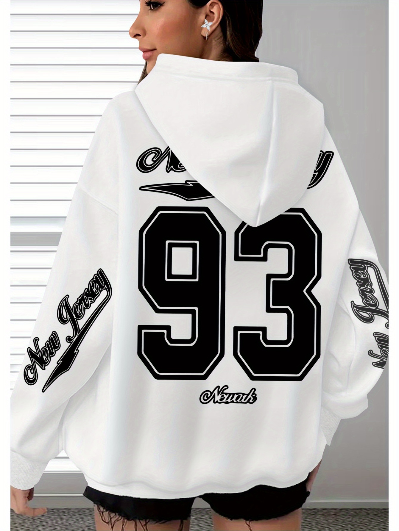 [Plus Size Hoodie] Soft Women's Plus Size Oversized Hoodie with New Jersey 93 Graphic Print | Machine Washable, Comfortable Clothing, Durable Fabric, Streetwear Fashion, Relaxed Fit, Breathable Material, Unisex Style, Black with White Lettering
