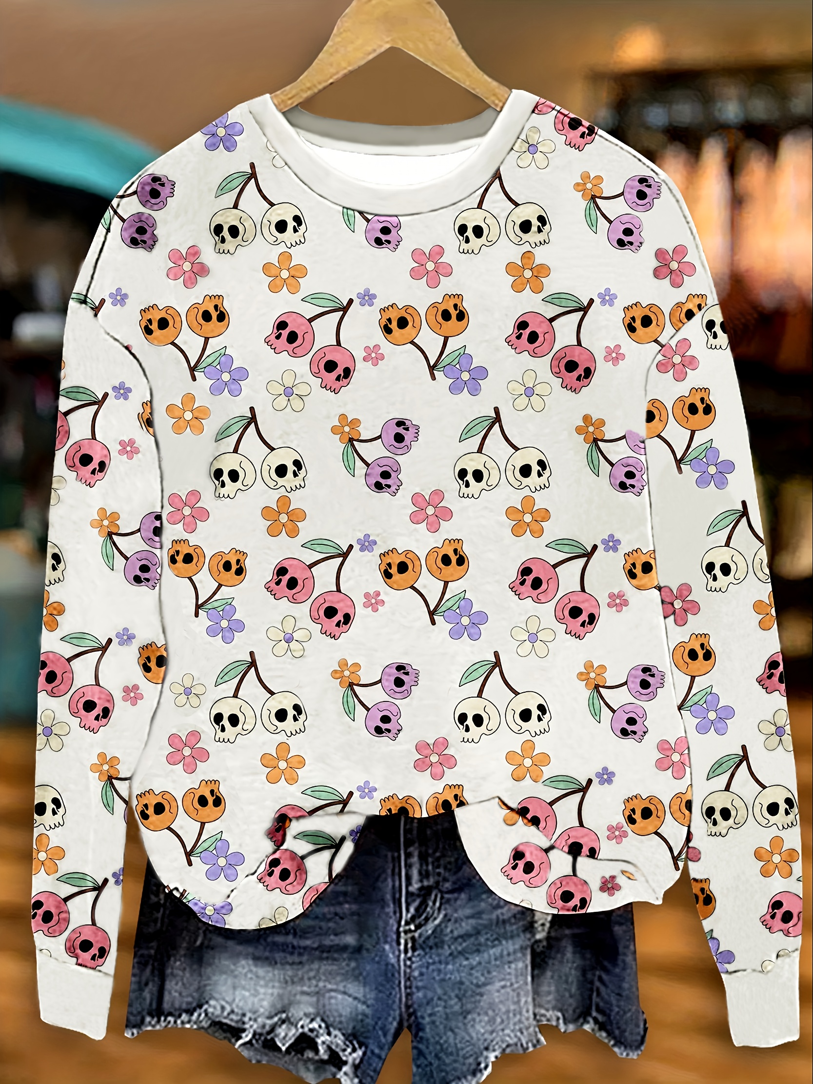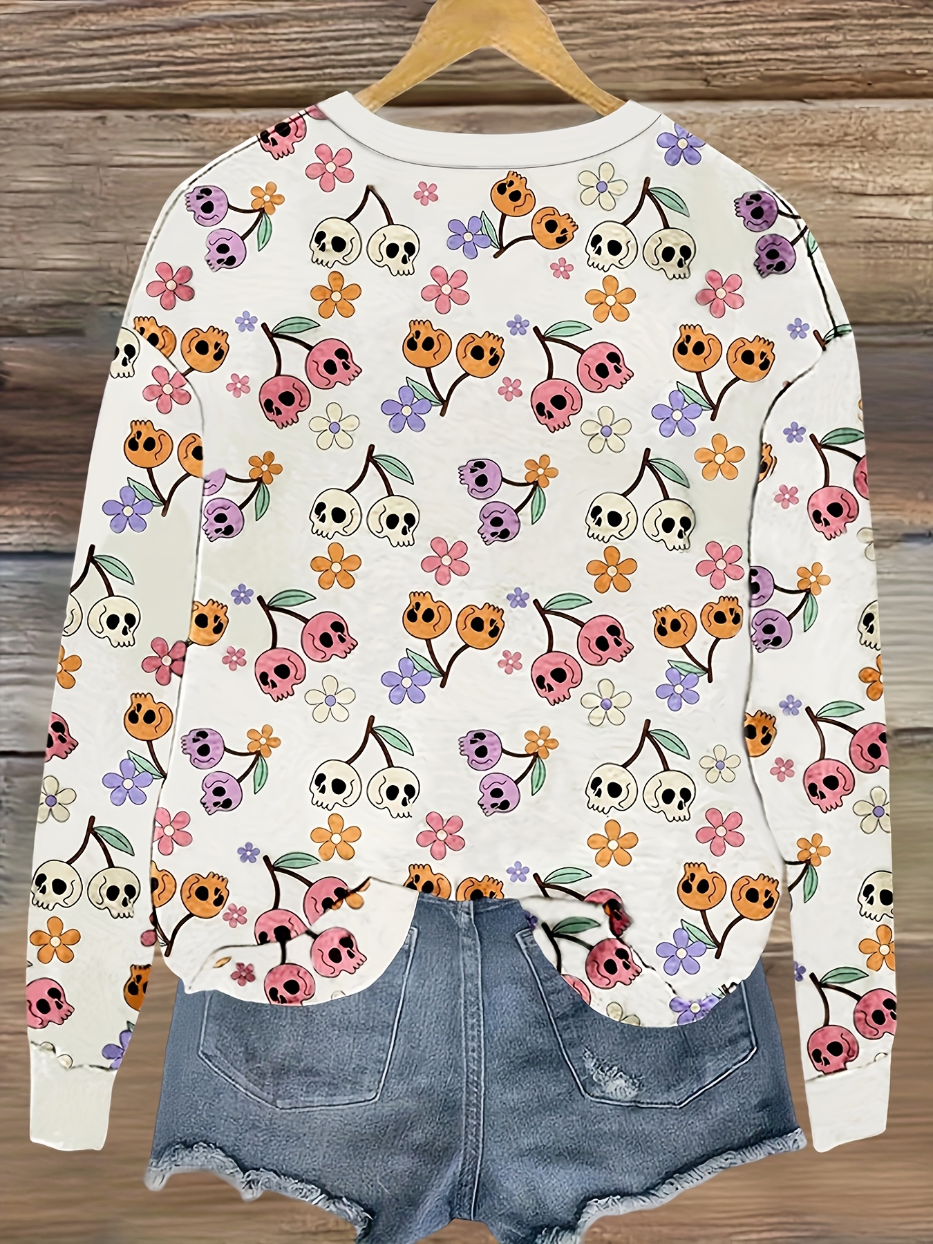 Plus Size - Women'S Plus Size Halloween Graphic Sweatshirt - Casual Crew Neck Pullover with Skull & Pumpkin Print, White with Black & Orange Design, Short Sleeve, All-Season Comfort Fit, Halloween Sweatshirt