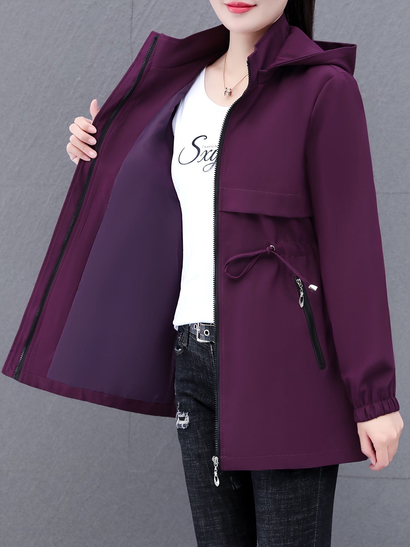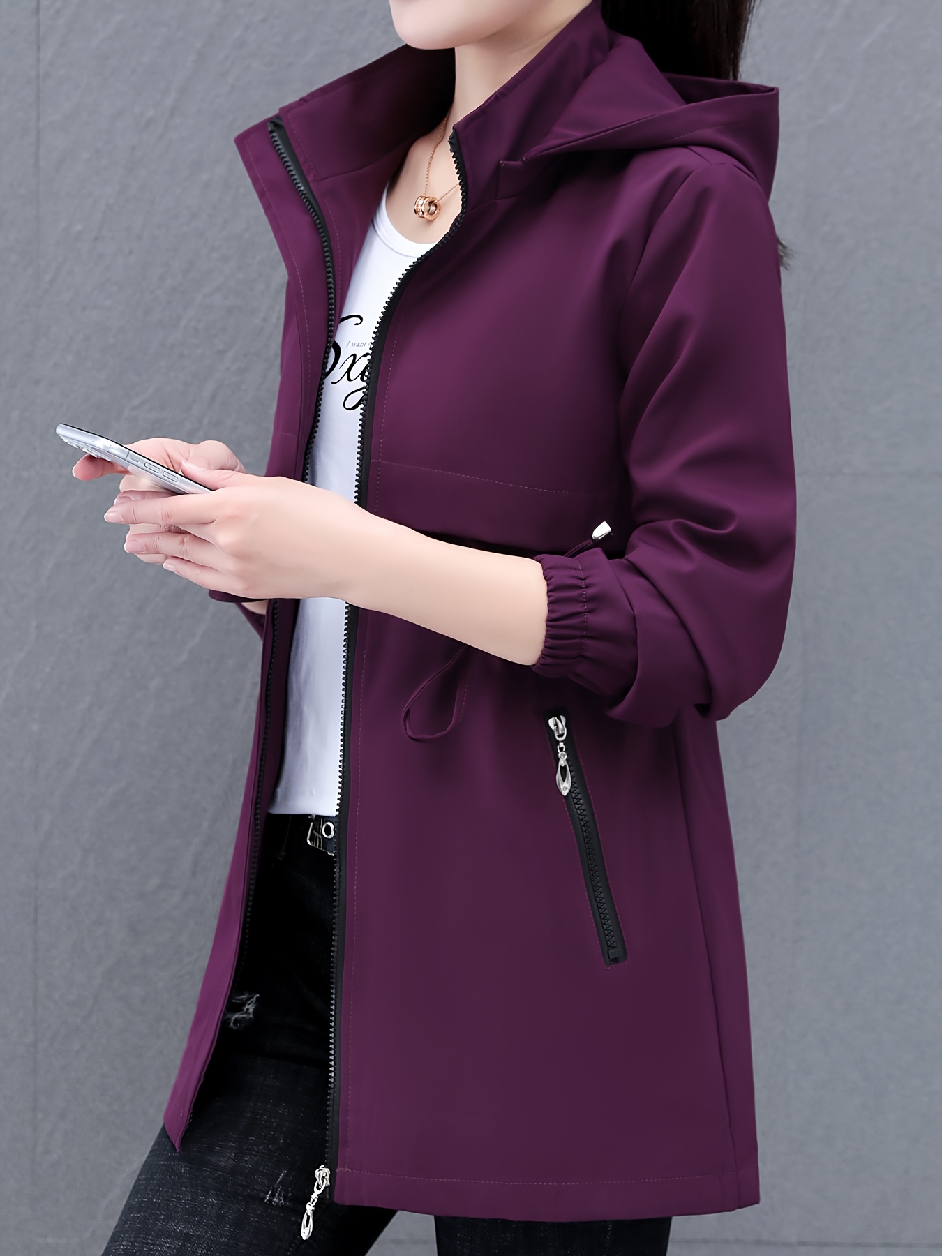 Women's Casual Korean-Inspired Windbreaker Jacket - Mid-Length Adjustable Drawstring Waist, Stand Collar & Zipper Front, Solid Color Spring/Fall Outerwear for Urban Commute & Casual Outings