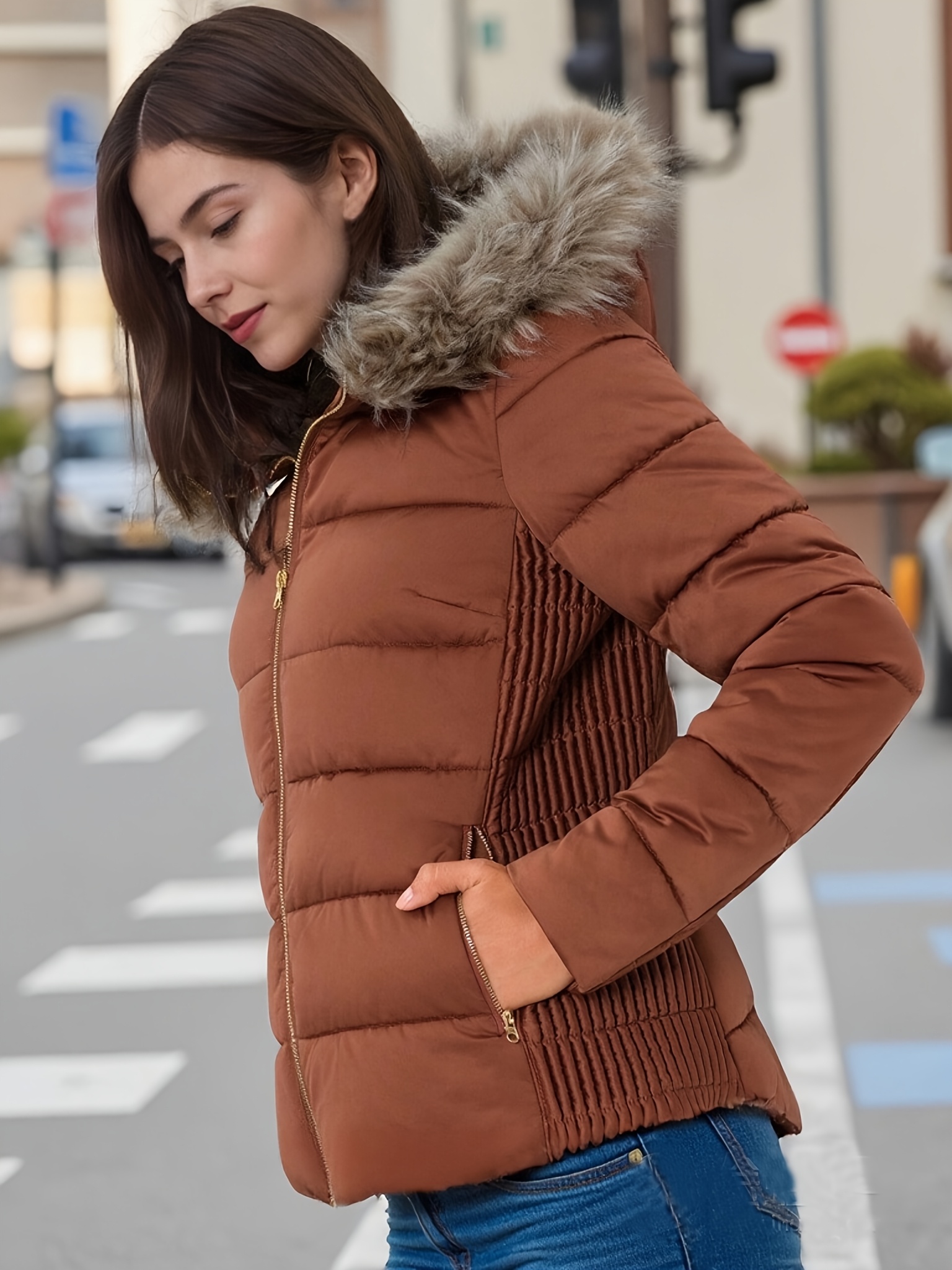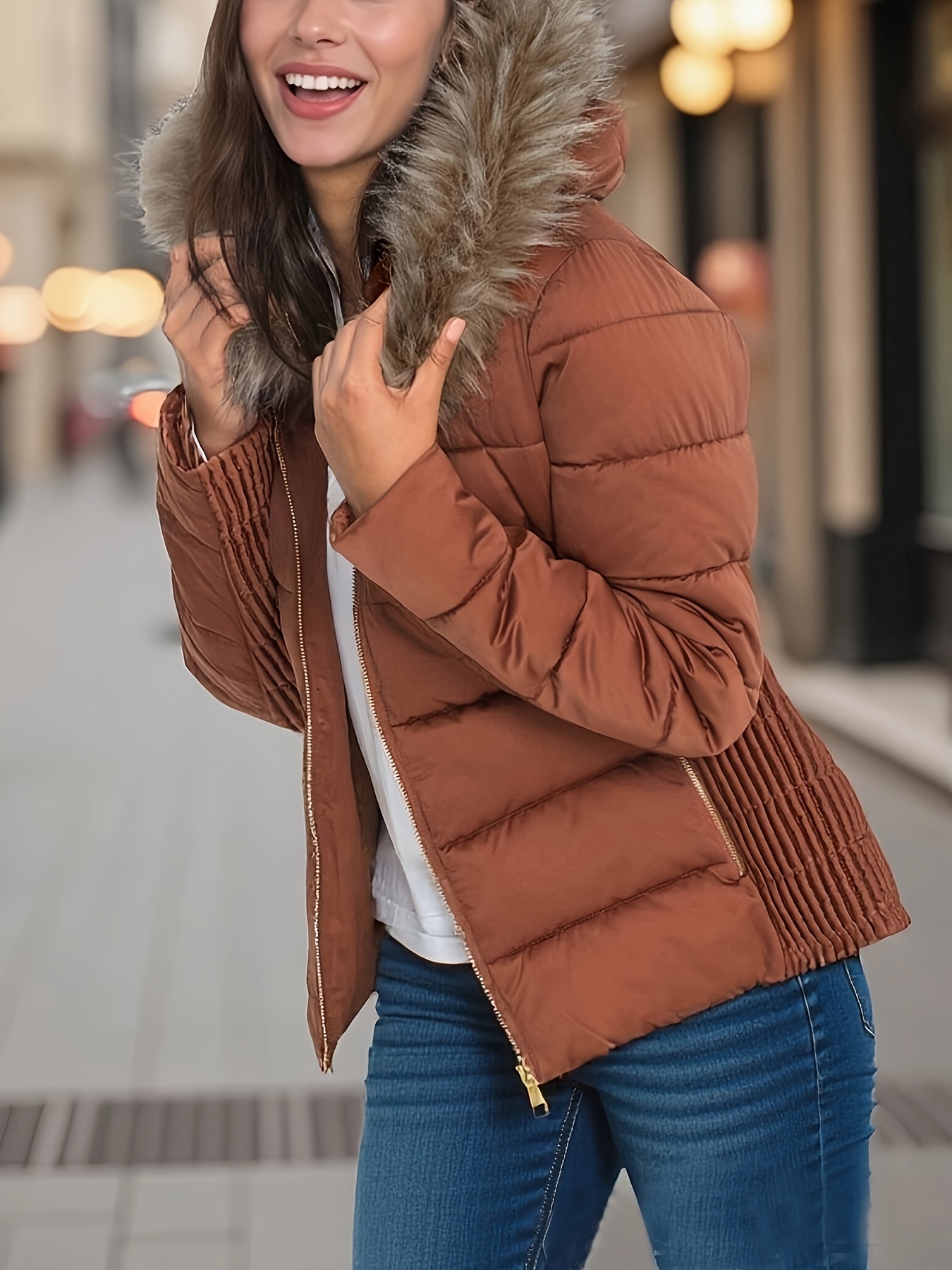 Women's Lightweight Quilted Hooded Jacket with Detachable Faux Fur Hood, Golden Metal Zipper & Side Gathers - Machine Washable Regular Fit Coat for Fall & Winter, Casual Outerwear