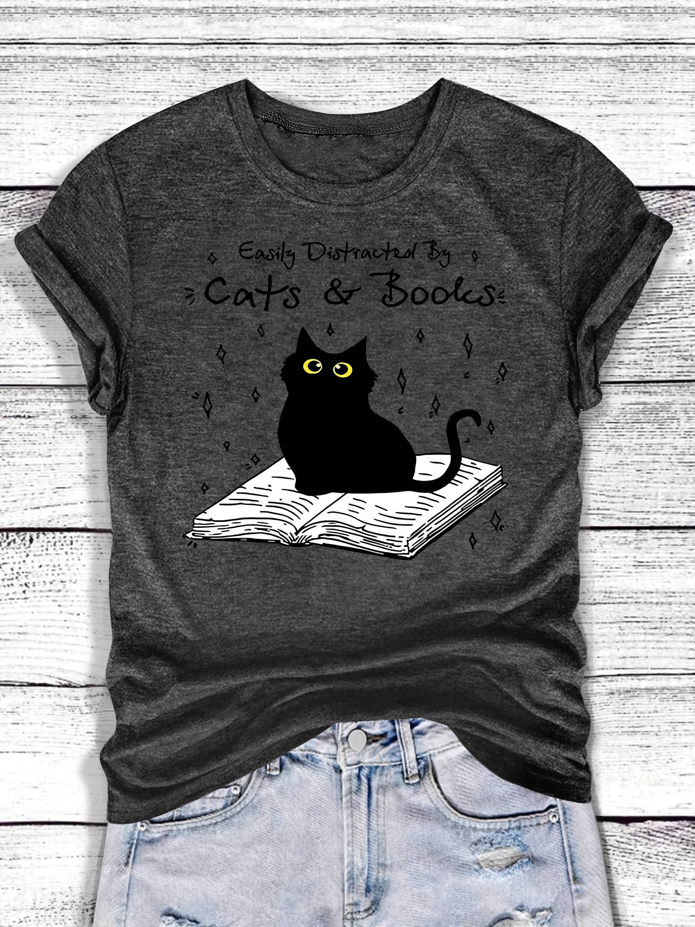 [Playful Cat T-Shirt] Lightweight & Stretchy Charming Black Cat & Book Illustration T-Shirt | Casual Crew Neck, Short Sleeve, Perfect for Spring & Summer, S-XXL, Cat Lover Gift