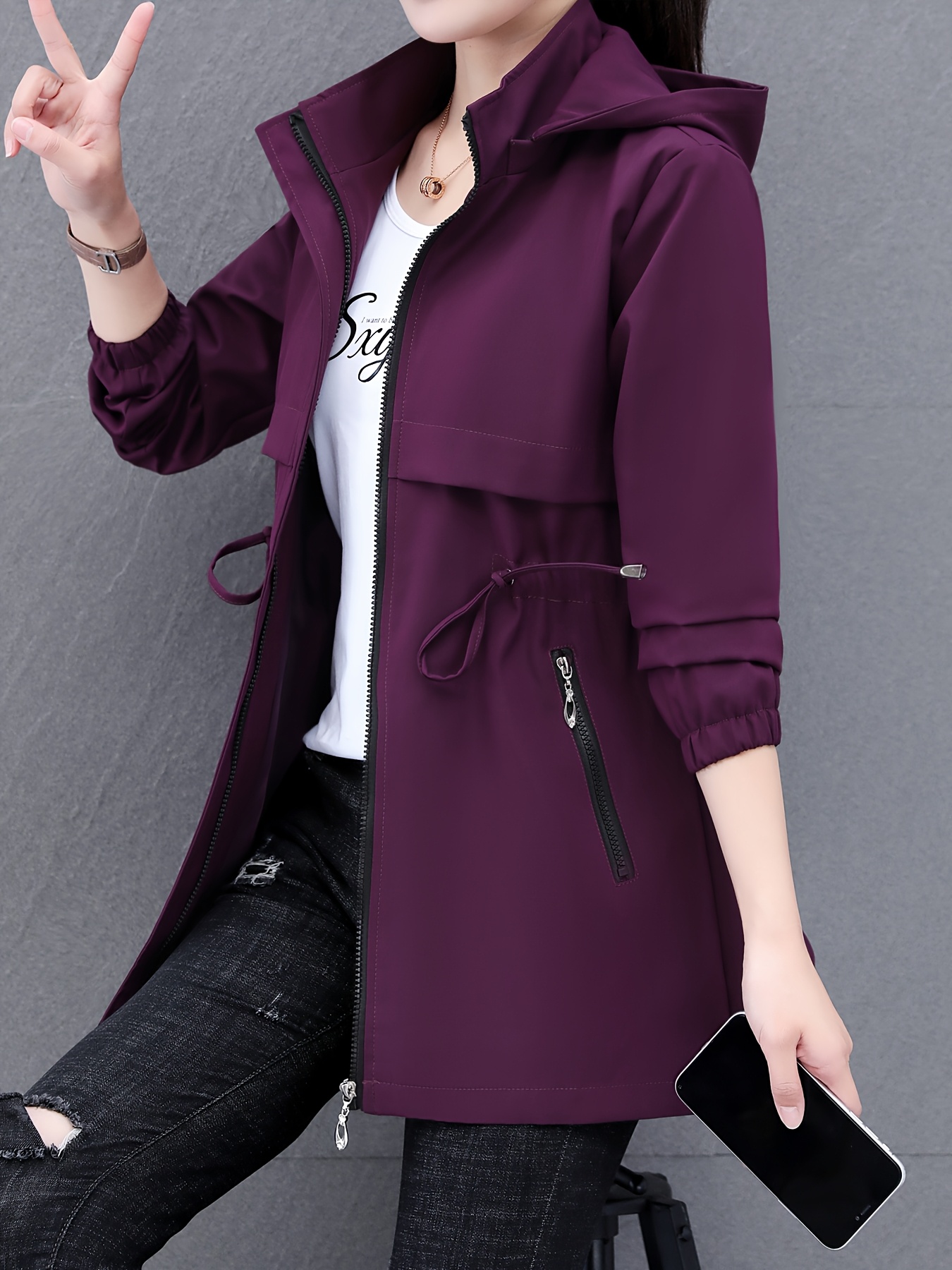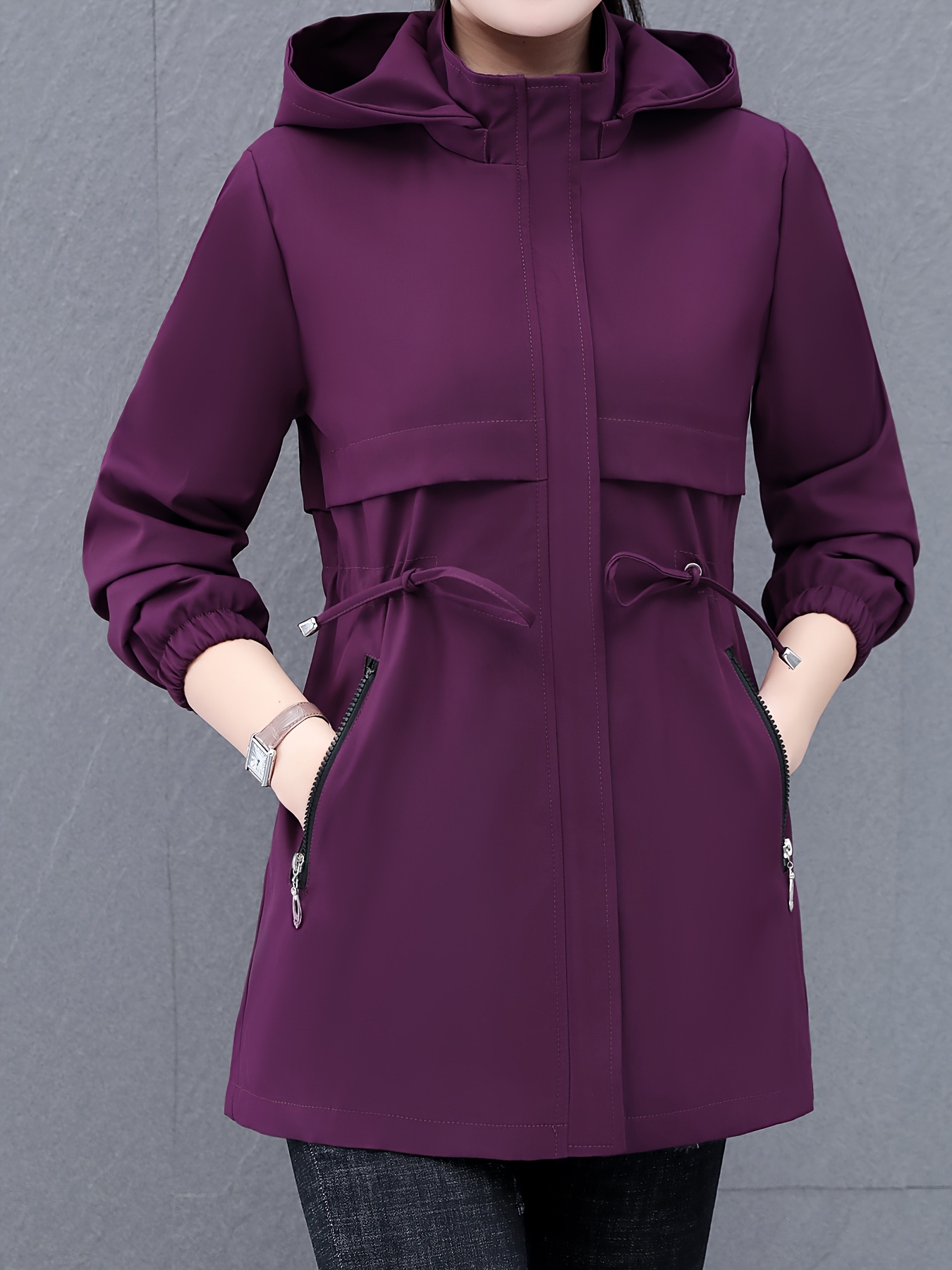Women's Casual Korean-Inspired Windbreaker Jacket - Mid-Length Adjustable Drawstring Waist, Stand Collar & Zipper Front, Solid Color Spring/Fall Outerwear for Urban Commute & Casual Outings