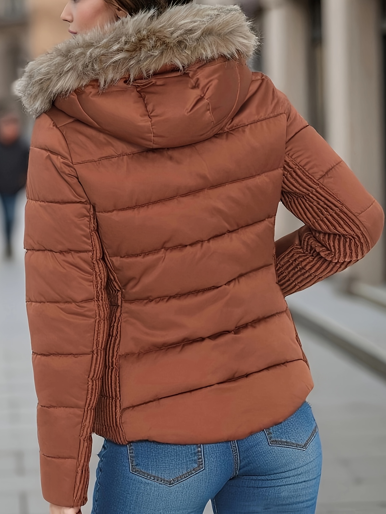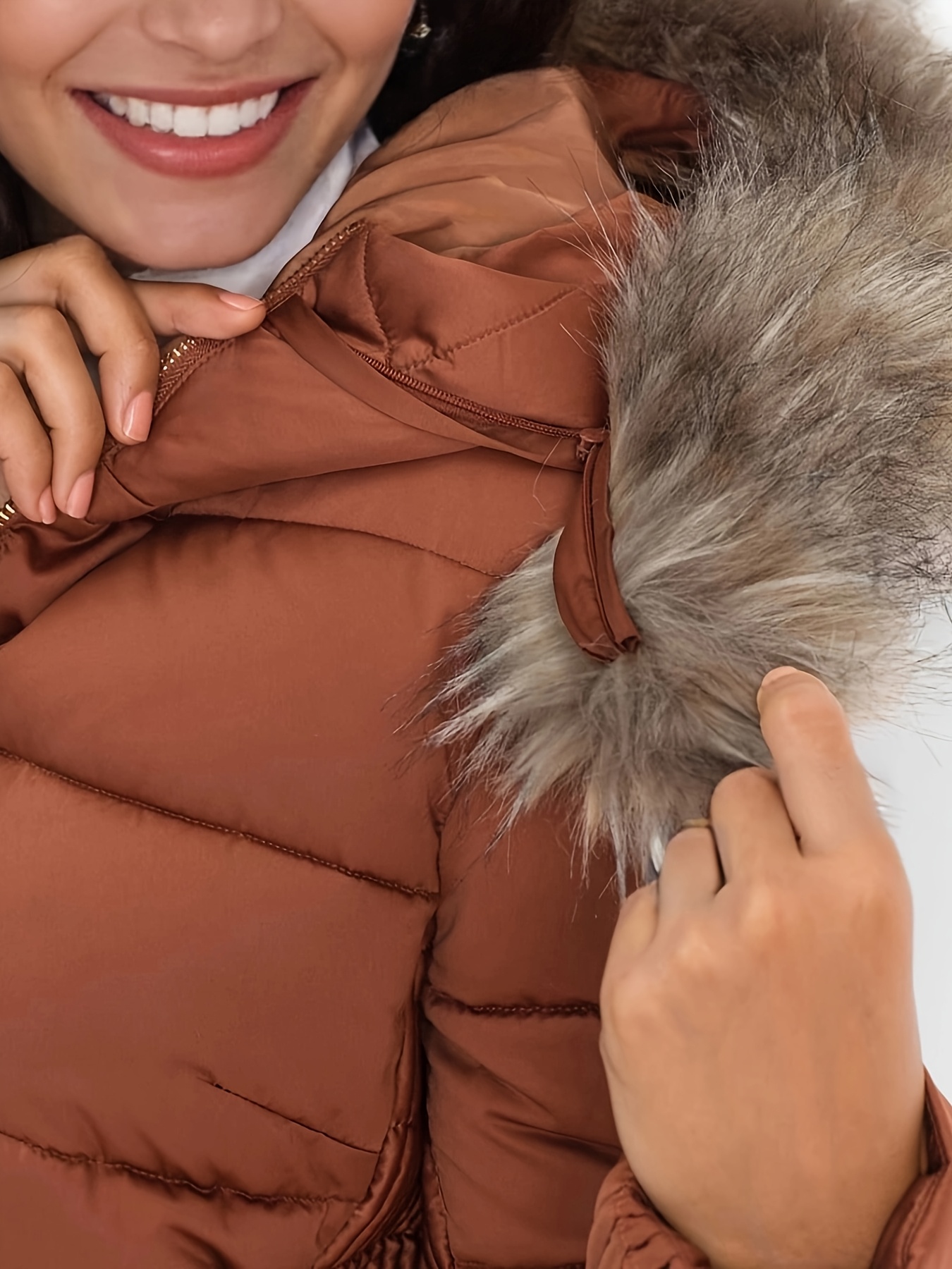 Women's Lightweight Quilted Hooded Jacket with Detachable Faux Fur Hood, Golden Metal Zipper & Side Gathers - Machine Washable Regular Fit Coat for Fall & Winter, Casual Outerwear