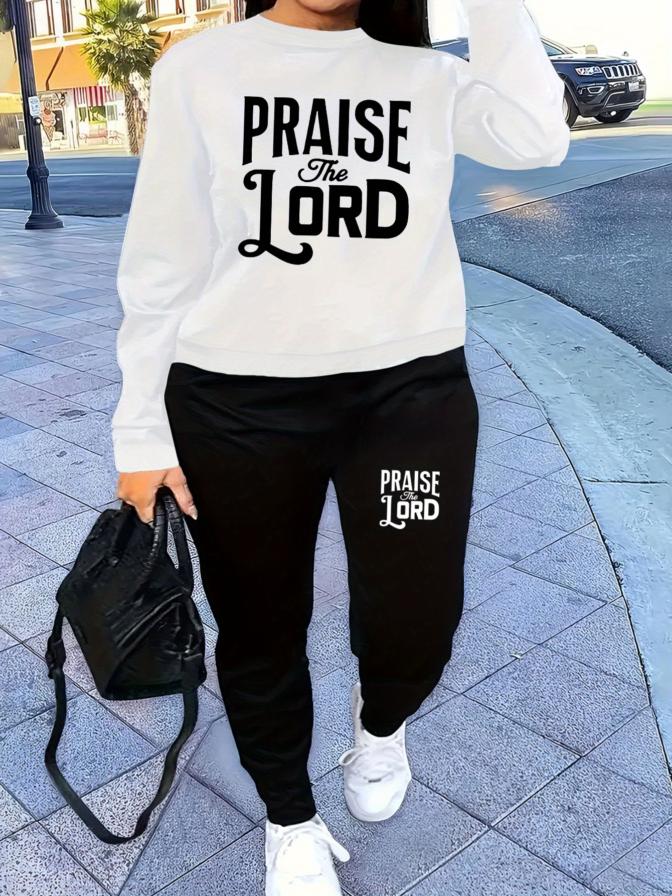 Women'S "Praise the Lord" Inspirational Letter Print Casual Sweatshirt and Jogger Set - Cozy Fall/Winter Outfit with Black Pants, White Sneakers, and Black Tote Bag, Inspirational Outfit | Crew Neck Top | Comfortable Fit