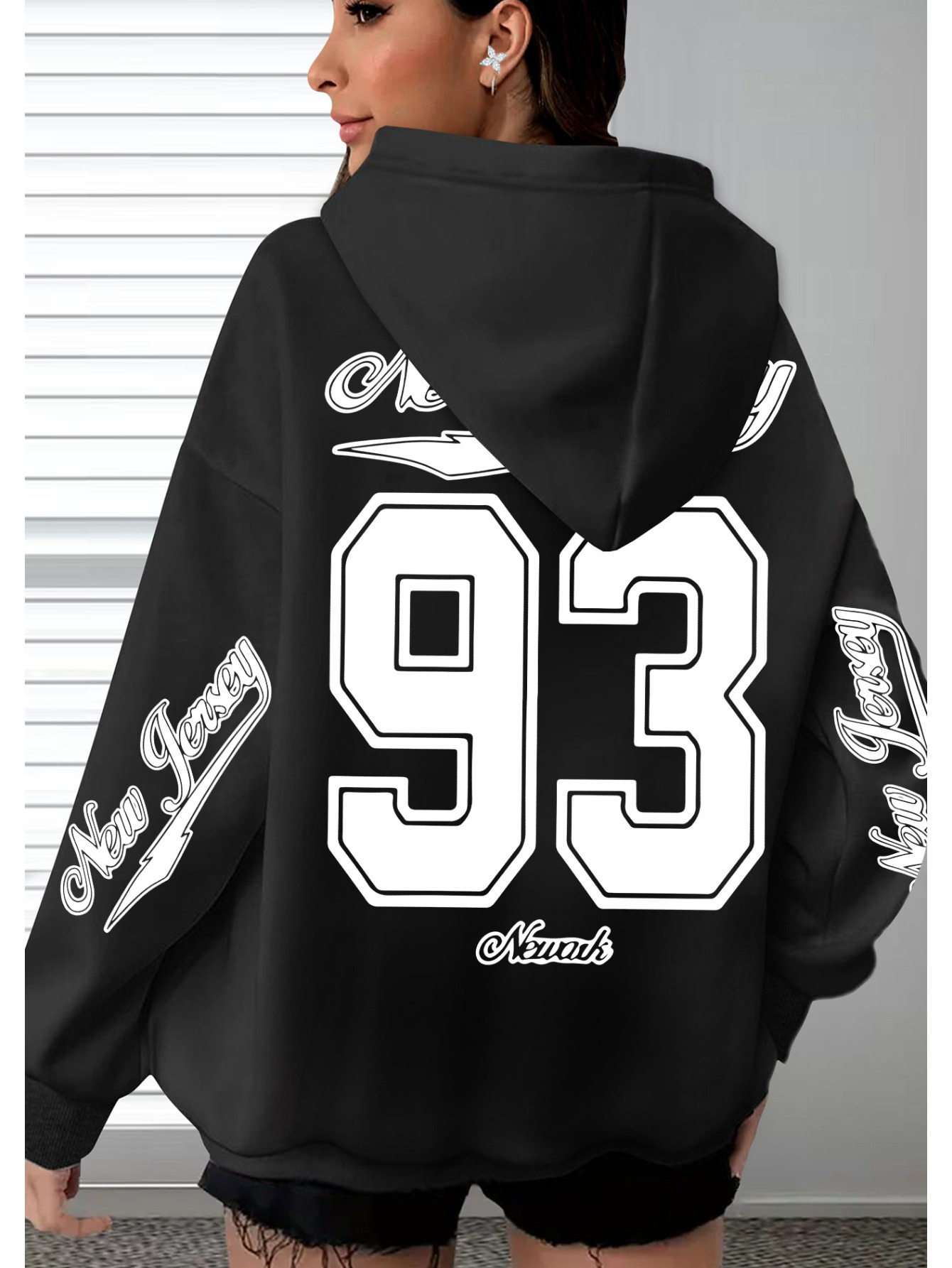 [Plus Size Hoodie] Soft Women's Plus Size Oversized Hoodie with New Jersey 93 Graphic Print | Machine Washable, Comfortable Clothing, Durable Fabric, Streetwear Fashion, Relaxed Fit, Breathable Material, Unisex Style, Black with White Lettering