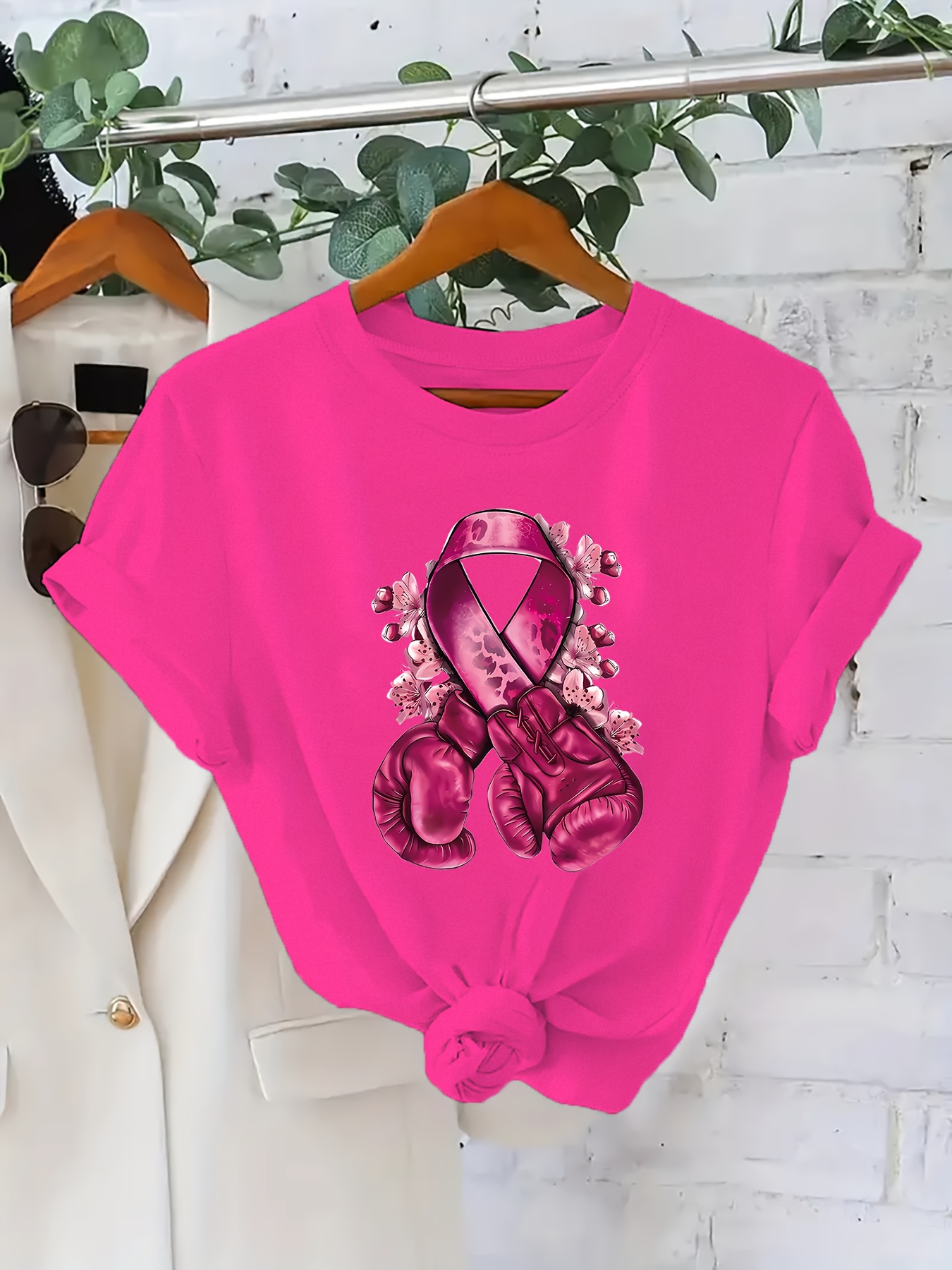 Plus Size, Women's Breast Cancer Awareness T-Shirt - Non-Transparent Black Top with Pink Boxing Gloves, Charity Event Apparel for, Survivor Gifts - Machine Washable Summer Shirt, Wear, Geometric Print, Comfortable Fabric, Casual Wear, Gift Shoppers